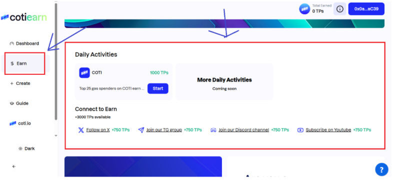 Sau khi đăng nhập thành công, ae vào mục Earn, hoàn thành các nhiệm vụ kết nối tài khoản xã hội. Sau khi kết nối ae nhớ click để claim TPs nha.