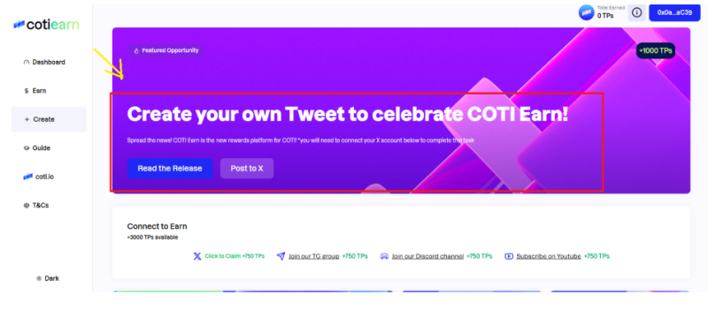 - Dự án đã XÁC NHẬN Airdrop cho user tham gia kiếm điểm TPs. Điểm này sẽ được chuyển đổi sang $COTI ở cuối mùa. Giá $COTI hiện đang ở 0.047$