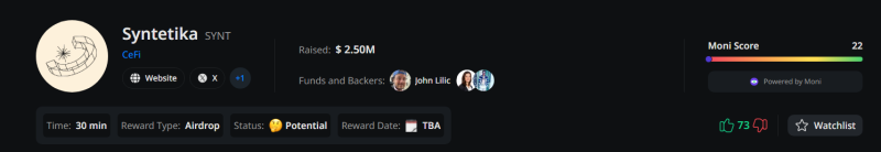 - Đã gọi vốn được 2.5 triệu đô: https://crypto-fundraising.info/projects/syntetika/