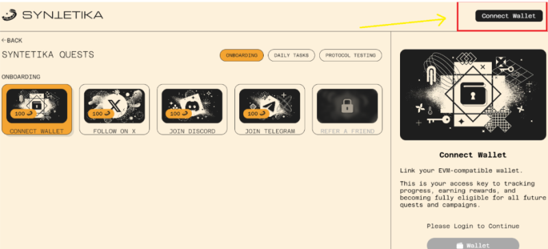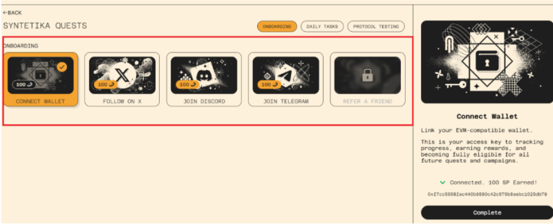 Hoàn thành các nhiệm vụ cơ bản trong mục ONBOARDING như: Kết nối ví, Follow X, Join Discord, Join Tele.
