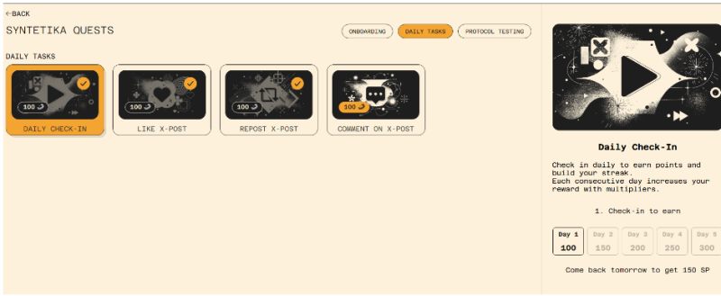 Syntetika đã công bố ra mắt Syntetika Hub, với nhiều nhiệm vụ đa dạng. Hiện tại, có 16 nhiệm vụ. Khi hoàn thành các nhiệm vụ trong Hub, chúng tôi sẽ tích lũy điểm, có thể được quy đổi thành token dự án trong tương lai!