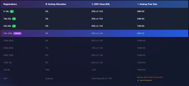Mọi người có thể kiếm điểm ORO, điểm này sẽ được chuyển đổi thành token $KII tại TGE. Pool aridrop phụ thuộc vào số lượng người đăng kí tham gia Testnet, hiện chưa tới 100k người đăng kí, nên ae tham gia sớm để lấy lợi thế nha.