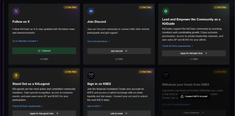 Kii Chain đã công bố ra mắt mạng thử nghiệm! Bạn có thể hoàn thành các nhiệm vụ trên nền tảng và nhận điểm ORO. Điểm ORO này có thể được chuyển đổi thành token $KII trong tương lai.