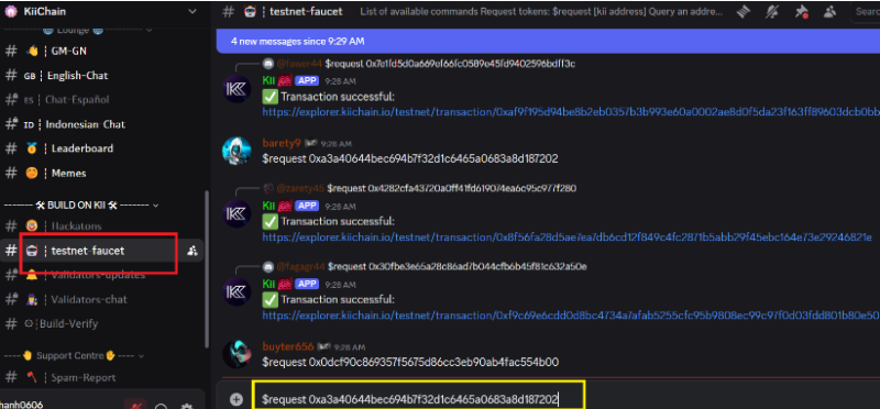 Sau khi có role KiiPer, ae vào kênh #testnet-faucet => Nhập lệnh $request + địa chỉ ví của ae để tiên hành Faucet token testnet.